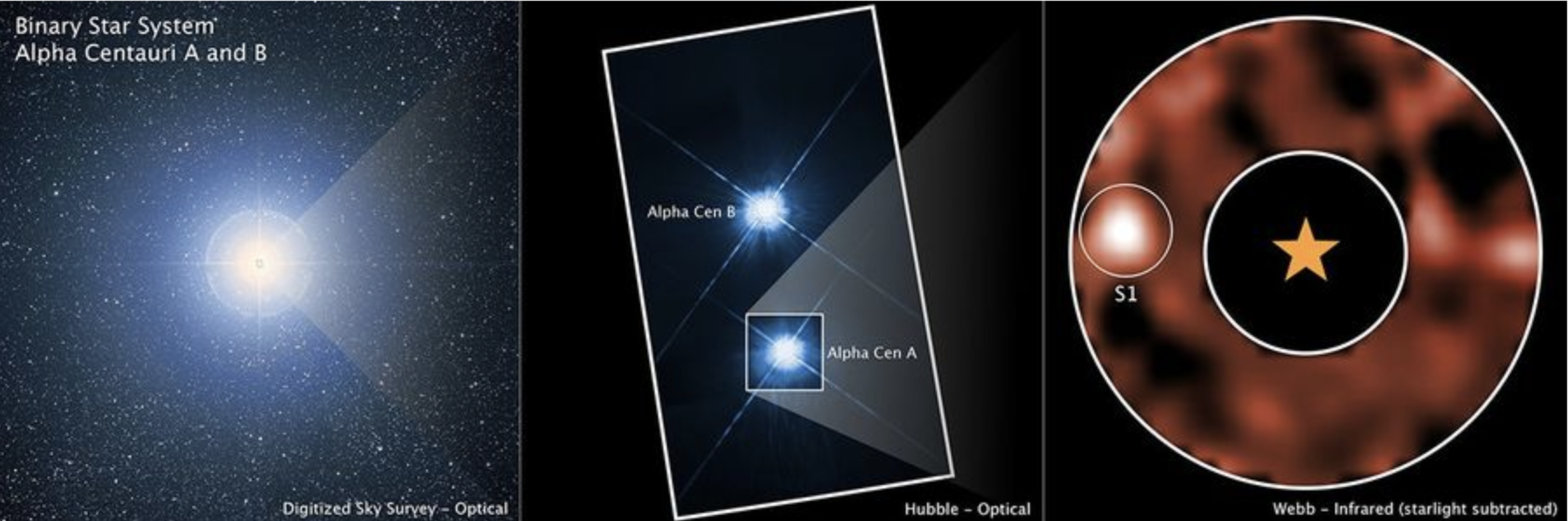 This image shows the Alpha Centauri star system from several different ground- and space-based observatories: the Digitized Sky Survey (DSS), NASA’s Hubble Space Telescope, and NASA’s James Webb Space Telescope. The ground-based image from DSS shows the triple system as a single source of light, while Hubble resolves the two Sun-like stars in the system, Alpha Centauri A and Alpha Centauri B. The image from Webb’s MIRI (Mid-Infrared Instrument), which uses a coronagraphic mask to block the bright glare from Alpha Centauri A, reveals a potential planet orbiting the star.